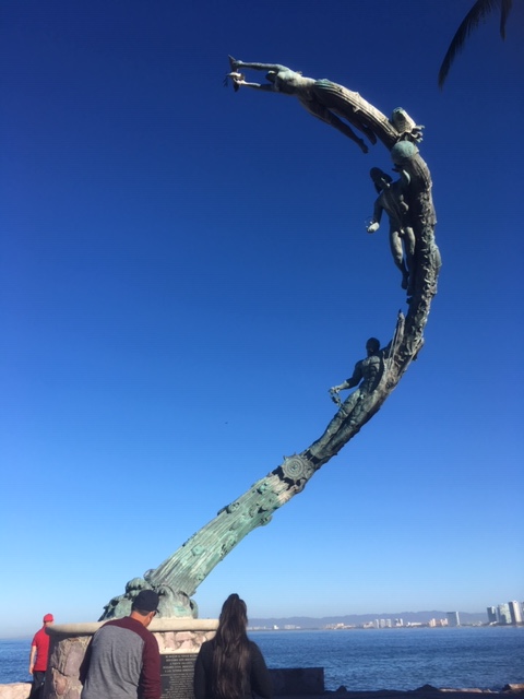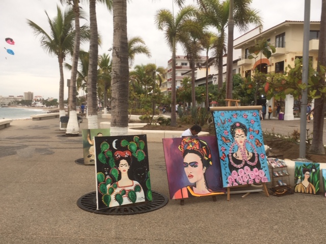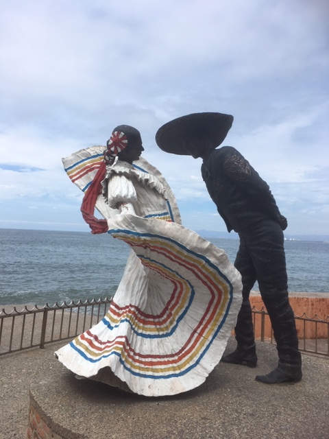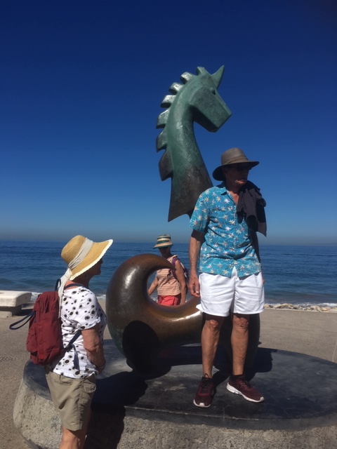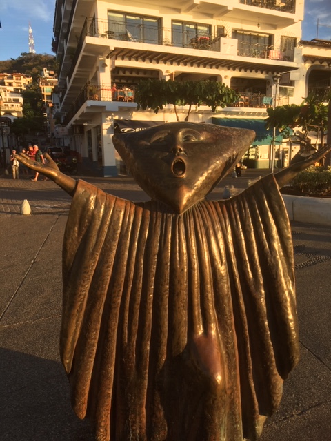 Framed by spectacular views of Banderas bay, 45 bronze sculptures, some striking and soaring, others just strange, decorate the Malecon, positioned about every 100 yards. Each one is unique – and the work of a different Mexican artist. Some were built 40 years ago– and others just a few years back. A highlight of our visit was taking a free sculpture tour offered by Galleria Pacifica every Tuesday morning at 930am and Thursday afternoon at 6. It began just beside our Hotel Rosita with The Millennium, a striking work by Matthew Lidice to commemorate the turn of the century in 2001 – and our striving through power, knowledge and reaching for freedom in troubled times. One of my favourites was the sculpture of two lovers called “Nostalgia”, inspired by the artist’s (Jose Ramiz Barquet) own love story. Another favourite of mine was “the subtle stone eater” by Jonás Gutiérrez, who as a boy had come back to a stretch of rocky beach one day to find all the stones gone – and perhaps was presenting an explanation. As part of the tour Kevin Simpson, of Colectika and Peyote People art galleries, also explains the many Huichol symbols etched into the Malecón’s pavement. The tour ends at the lovely Galleria Pacifico, just one of the inspiring art spaces you can discover in the old town. <Click here> to go to the facebook page for the sculpture tour.