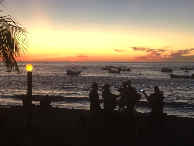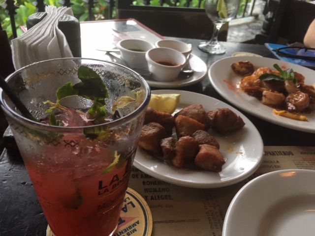 If you grow tired of tacos and fajitas, drop into La Bodeguita del Medio for a taste of Old Havana. This replica of an original 1940s Havana meeting place for artists, has wonderful music, a forbidden, counterculture vibe, dark, graffitied walls, gentle cigar aromas wofting from downstairs… and delicious mojitos, including a favourite of the writer Hemmingway, a passionate patron of the original in Havana. On the drizzly late afternoon when we arrived, we grabbed a sea-view seat upstairs and enjoyed strawberry mojitos along with some piquant Cuban pork and sweet shrimp dishes listening to a lively quartet play Tito Puente (one of my faves)…until the sun set in blazing red and deep yellow over the bay.